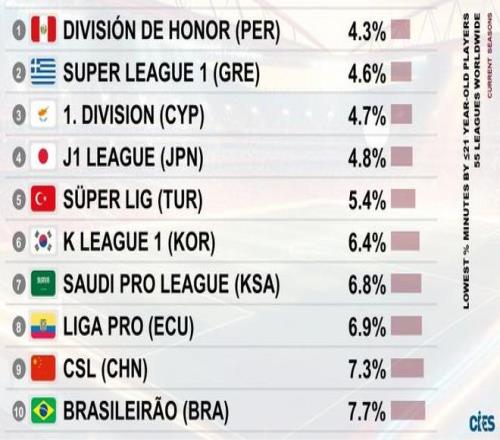 近日,瑞士著名足球權威統(tǒng)計機構CIES(國際體育研究中心)發(fā)布了一份針對全球55個頂級聯(lián)賽的最新統(tǒng)計報告,衡量各國聯(lián)賽對年輕球員的培養(yǎng)力度,U21球員出場時間占比。這份榜單的排名方式是由低到高,即排位越靠前,代表該聯(lián)賽的U21球員出場時間占比越少,也意味著這個聯(lián)賽越不給年輕人機會。榜單數(shù)據(jù)顯示,中超聯(lián)賽在這份榜單的排名中高居前列,揭示了中國足球在青訓轉化上的深層危機。