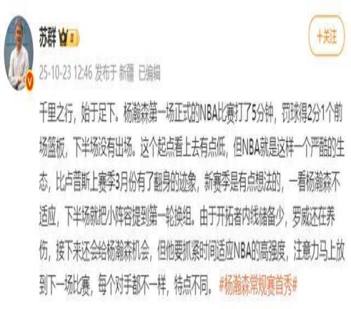 蘇群表示:千里之行,始于足下。希望他抓緊時間適應(yīng)NBA的高強(qiáng)度,注意力馬上放到下一場比賽。