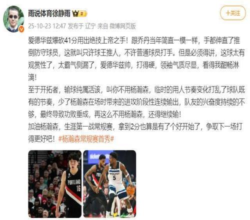 多位知名籃球評論員也在賽后發(fā)文,對楊瀚森首秀的表現(xiàn)給予贊賞和鼓勵。