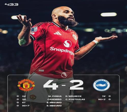下半場,姆伯莫上演梅開二度,盡管布萊頓憑借維爾貝克的任意球直接破門,以及科斯圖拉斯頭球破門,但他們還是在客場2-4不敵曼聯(lián)。