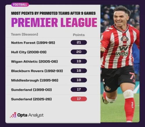 賽后據(jù)統(tǒng)計(jì),桑德蘭本賽季前9輪聯(lián)賽戰(zhàn)績,也能能夠排在英超聯(lián)賽第6的。數(shù)據(jù)統(tǒng)計(jì)顯示,他們在英超歷史升班馬中都位列前茅。